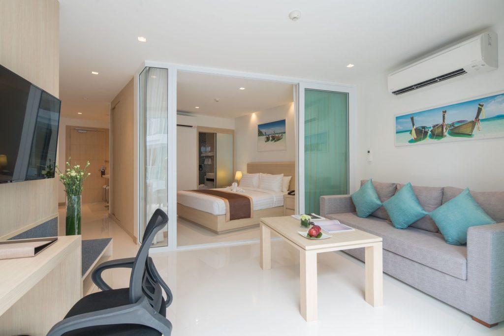 1 Bedroom Suite สิ่งอำนวยความความสะดวกเหมือนห้อง Superior แต่ขนาดห้องใหญ่กว่า ห้องนี้ขนาด 50 ตารางเมตร ห้องนอน จะแยกกับห้องนั่งเล่นและห้องครัว มีให้เลือกทั้งเตียงเดี่ยวและเตียงคู่ และ 1 Bedroom Suite Seaview จะเห็นวิวทะเล