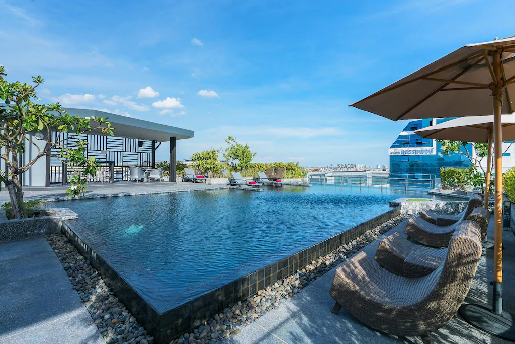 - Rooftop Pool: จุดขายอันดับหนึ่งคือสระว่ายน้ำดาดฟ้า ที่คุณสามารถว่ายน้ำไปพร้อมกับชมวิวเมืองย่านศรีนครินทร์ได้