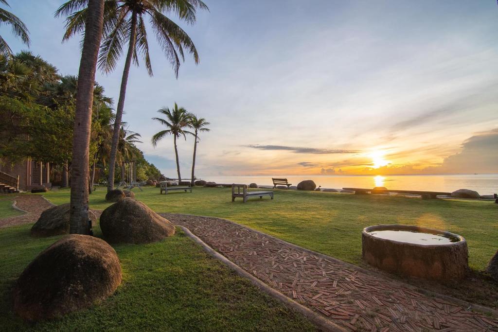 - Vibe Check (จุดเด่น): ที่พักสายกิจกรรมและคนรักสัตว์อีกแห่ง! ที่นี่ “Pet-Friendly”บรรยากาศดีมากเพราะ “ด้านหน้าเป็นทะเลสวยสดใส ด้านหลังโอบล้อมด้วยภูเขา” มีกิจกรรมให้พายเรือคายัคฟรี และมีห้องอาหารริมหาดของตัวเองชื่อ “Chomtalay Restaurant”