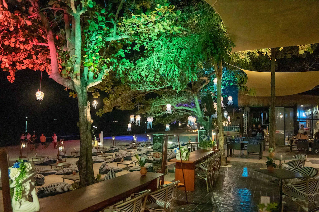 - วิเคราะห์ความสนุก: บรรยากาศร้านอาหารริมหาดของรีสอร์ตมีความโรแมนติกและคึกคักในช่วงค่ำ