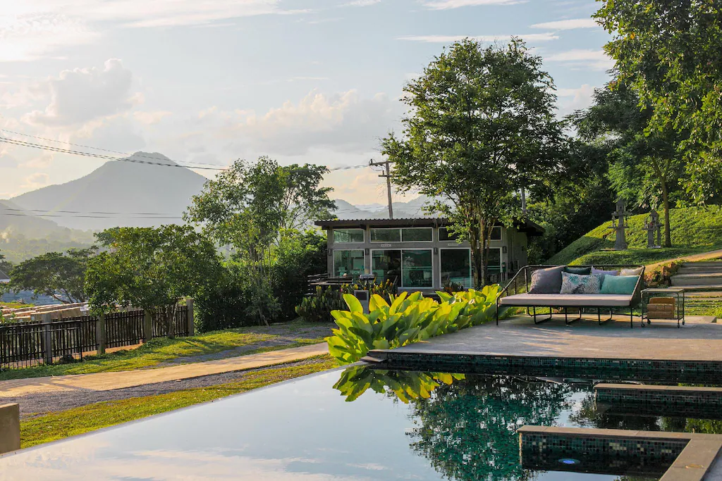 - สรุปเนื้อหา: ที่พักสไตล์บ้านพักตากอากาศหลังใหญ่ที่ให้ฟีลเหมือนอยู่ยุโรป บ้านพักรูปทรง A-Frame ตั้งอยู่บนเนินเขาที่เห็นวิวเทือกเขาตะนาวศรีได้ชัดเจนที่สุด เหมาะสำหรับครอบครัวหรือกลุ่มเพื่อนที่อยากมาแคมป์ปิ้งแบบเป็นส่วนตัว มีพื้นที่ปิ้งย่างและอุปกรณ์ครัวครบครัน บรรยากาศยามเช้าที่นี่จะมีหมอกจางๆ คลุมยอดเขาให้เห็นจากระเบียงห้องพักเลย ความสงบเงียบและความเป็นส่วนตัวคือจุดแข็งที่ทำให้หลายคนเลือกมาพักที่นี่ก่อนจะเดินทางต่อไปยังพะเนินทุ่ง