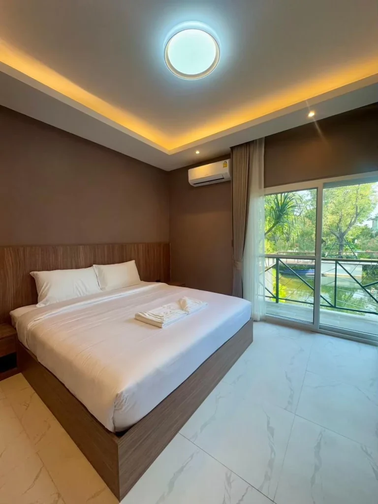 - สรุปเนื้อหาที่พัก: ที่พักกึ่งเซอร์วิสอพาร์ทเม้นท์ที่ได้รับคำชมเรื่องความสะอาดระดับสิบดาว! ตัวห้องพักออกแบบได้ทันสมัย ใช้เฟอร์นิเจอร์คุณภาพดีและจัดวางได้เป็นสัดส่วนมาก จุดเด่นที่สุดที่ทุกคนต้องพูดถึงคือ “เตียงนอน” ที่นุ่มสบายจนไม่อยากลุกไปไหน ห้องพักมีระเบียงให้ออกไปรับลมชมวิวทุ่งนาไกลๆ ได้ฟีลพักผ่อนสุดๆ ตั้งอยู่ในทำเลที่เชื่อมต่อไปยังถนนบ้านกล้วย-ไทรน้อยได้สะดวกมาก เป็นที่พักที่ตอบโจทย์ทั้งคนทำงานและนักท่องเที่ยวที่เน้นความเรียบหรูในราคาเบาๆ การันตีว่ามาพักแล้วจะติดใจจนต้องกลับมาซ้ำแน่นอนครับ