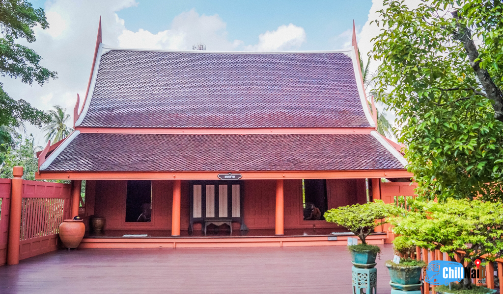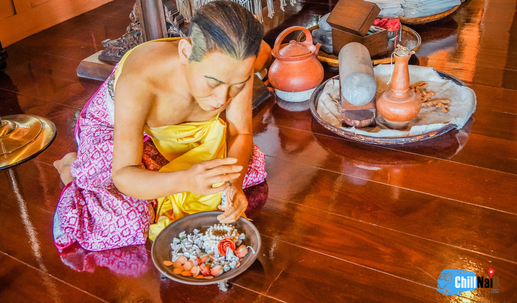 เรือนไทยแต่ละหลังที่ตั้งอยู่ใน อุทยาน ร.2 แห่งนี้ ก็คือที่จัดแสดงศิลปะวัฒนธรรมที่มีมาตั้งแต่สมัยรัชกาลที่ 2 รวมไปถึงวิถีความเป็นอยู่ของผู้คนในสมัยนั้นด้วย เรามาเริ่มกันเรือนด้านหน้าสุดกันเลย เรือนนี้มีชื่อว่า อาศรมศึกษา โดยตัวอาคารถูกออกแบบในสไตล์ไทยแท้ เป็นบ้านทรงไทยที่ทำขึ้นจากไม้ ภายในอาคารแห่งนี้ก็จะจัดแสดงเมนูอาหารทั้งอาหารคาวและอาหารหวานไว้ให้ได้ศึกษาว่าแต่ละชนิดคือขนมอะไร ซึ่งก็มีขนมหลายๆ อันเลยที่แอดมินเคยทานแต่ก็ไม่รู้จักชื่อหรือมีขนมที่รู้จักแต่ชื่อแต่ไม่เคยทานก็มี รับรองว่าเรือน อาศรมศึกษา นี้ จะทำให้เพื่อนๆ ได้มีความรู้เรื่องอาหารการกินของคนไทยในอดีตได้มากขึ้นแน่นอน