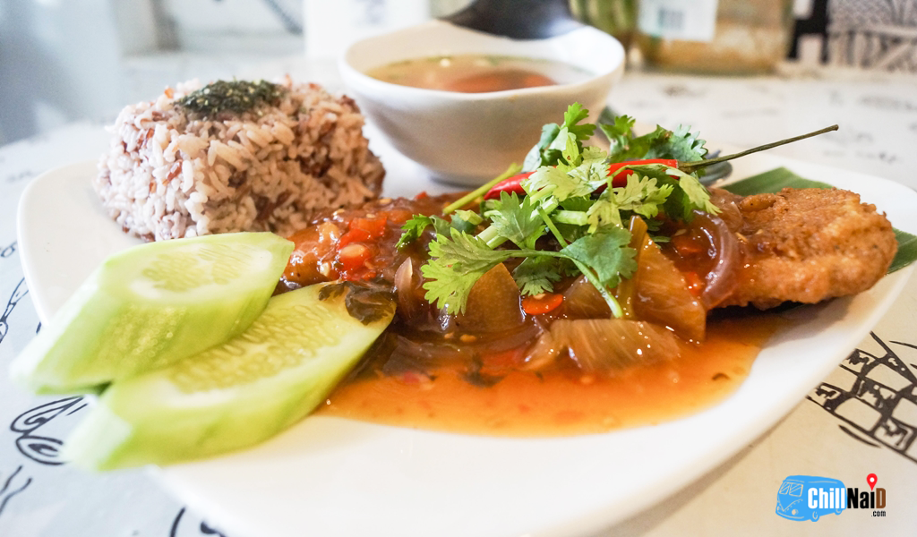 มาต่อกันที่เมนูที่สอง เหมาะสุดสำหรับใครที่ชื่นชอบการทานเนื้อปลา หรือกำลังควบคุมอาหารอยู่นิดๆ เพราะเมนูนี้คุณป้าให้เนื้อปลามาแบบเน้นๆ ชิ้นโตๆ ในเมนูที่มีชื่อว่า ปลา 2 ชิ้นทอดราดซอสสับปะรด ตัวซอสเข้มข้นที่ออกหวานติดเปรี้ยวนิดๆ แถมยังหอมกลิ่นสับปะรดอ่อนๆ พอทานคู่กับเนื้อปลาทอดสีเหลืองทองกรอกนุ่มในแล้ว บอกได้เลยว่าสวดยอดด!