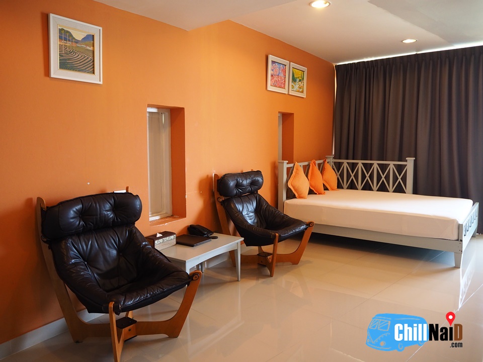 เปิดประตูมา จะเป็นห้องนั่งเล่น มีที่นั่งเล่น พร้อมกับที่นอนเสริมจัดไว้แล้ว 1 ชุด มีมุมครัว และอุปกรณ์ครัว เช่นเตาไมโครเวฟ มีระเบียงเปิดออกไป เห็นวิวทะเล