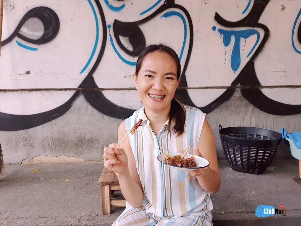 การนั่งกิน ก็นั่งที่นั่งข้างๆ ป้าแกเลยค่ะ ป้าแกจะเสียบเป็นไม้ๆ ปิ้งๆ ไปเรื่อยๆ จัดใส่จาน อันไหนสุกแล้ว แกก้อวางในจานให้ พร้อมกับมีถ้วยน้ำจิ้ม วางไว้ให้ ที่นี้ก้อบัลเลงกันเลยค่ะ อยากกินกี่ไม้ ก็จัดไป กินเสร็จคิดค่าเสียหายตามจำนวนไม้เลยค่ะ อิอิ